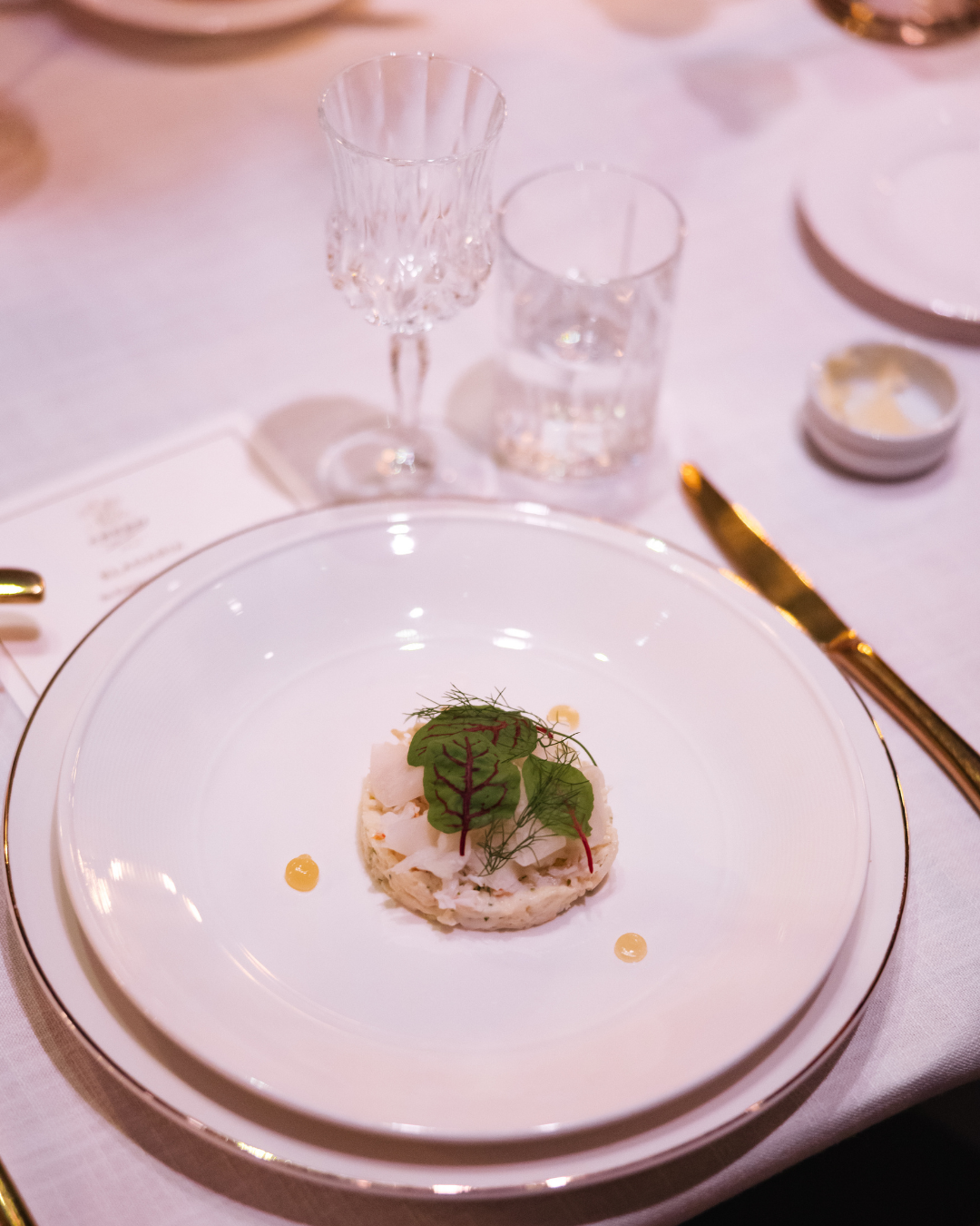 The entrée featured spanner crab with celeriac and pickled kohlrabi, while mains highlighted Glacier 51 Toothfish with truffle mousseline and champagne velouté, paired with a vegetarian option of King Oyster mushroom with almond aillade. Dessert was a showpiece in itself: vanilla and pandan mousse with a mandarin heart, echoing the citrus top notes of Eladaria. Every element of the menu was designed to feel luxurious, seasonal, and sustainably considered.