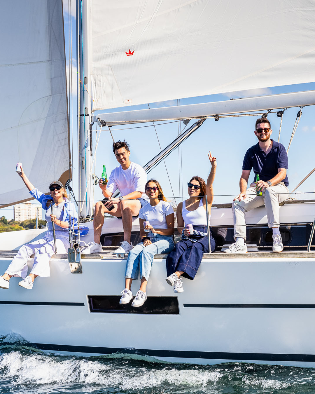 Each vessel received curated catering boxes featuring premium seafood platters including peeled prawns and Balmain bugs served with classic accompaniments such as lemon, mignonette and mayonnaise. These were complemented by an assortment of finger sandwiches, savoury quiches and chilled beverages including cold-pressed juices and refreshing drinks suitable for the harbour setting.